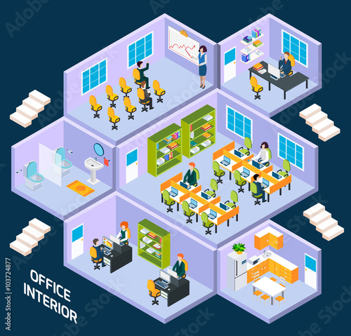 Veterinary clinic cutaway interior, vector flat isometric illustration. Vet clinic with furniture, veterinary equipment and supplies, veterinarians and clients with their pets.