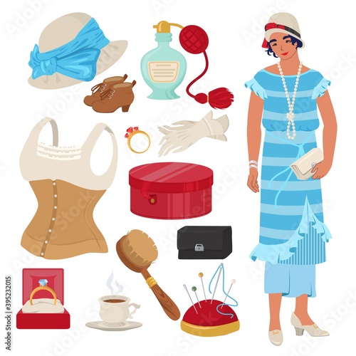 Victorian lady set, flat vector isolated illustration. English lady clothing and accessories. Corset, shoes, hat, perfume bottle, gloves, sewing kit, ring and box.