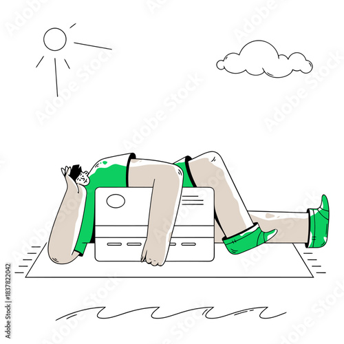 Huge professional video camera and micro characters film crew shooting movie, vector flat illustration. Videographer, director, girl with clapperboard making film. Cinema industry, movie production.