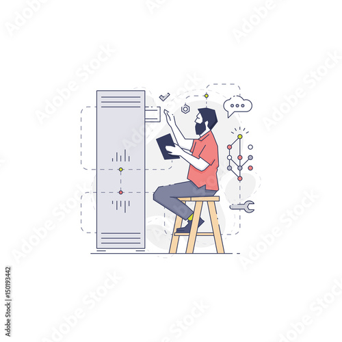 Huge professional video camera and micro characters film crew shooting movie, vector flat illustration. Videographer, director, girl with clapperboard making film. Cinema industry, movie production.