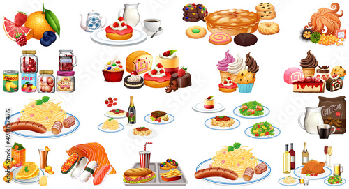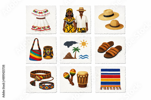Viking set, flat vector isolated illustration. Viking male and female cartoon characters, weapons, drakkar ship. Scandinavian warrior costume and equipment.