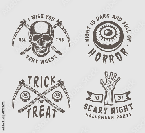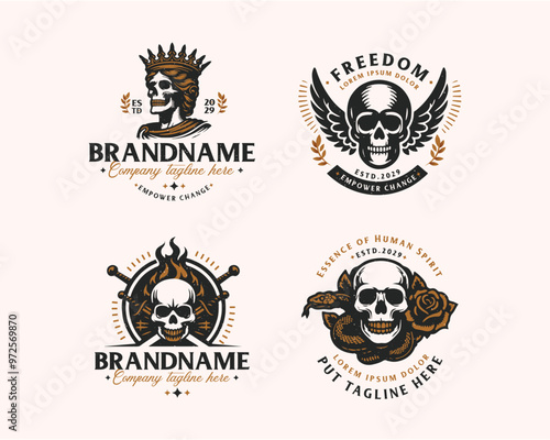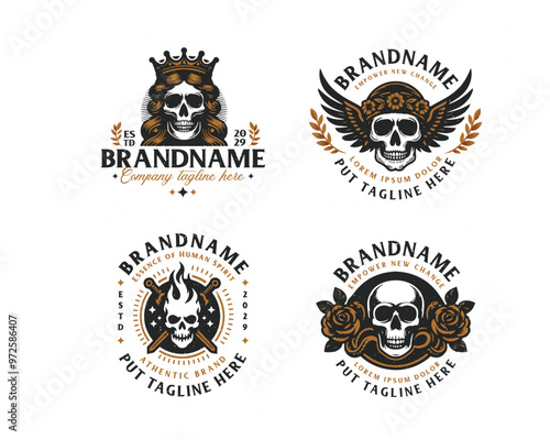 Vintage black moto skull labels, logos, emblems, badges vector illustration isolated on white background. Moto club, motor bike repairs and motorcycle service typography design.