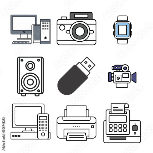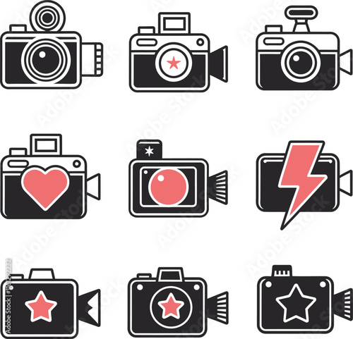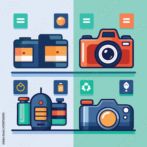 Vintage retro and modern photo camera vector icon set. Isolated digital and analogue photographer equipment and technique illustration