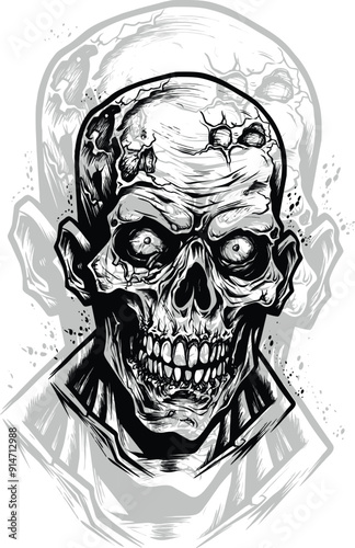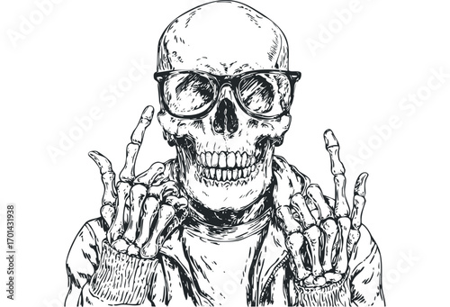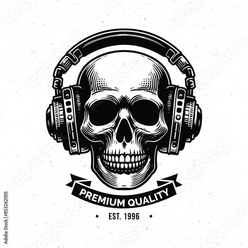 Rock Star vintage grunge design for t-shirt. Vector hand drawn illustration of bald skull with mustache, beard and devil horns listening to music.