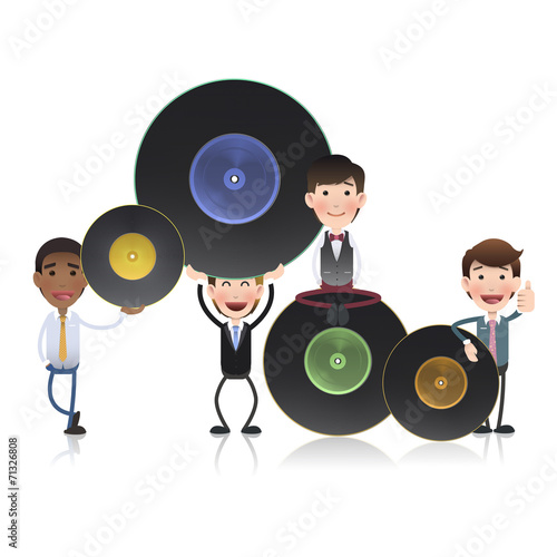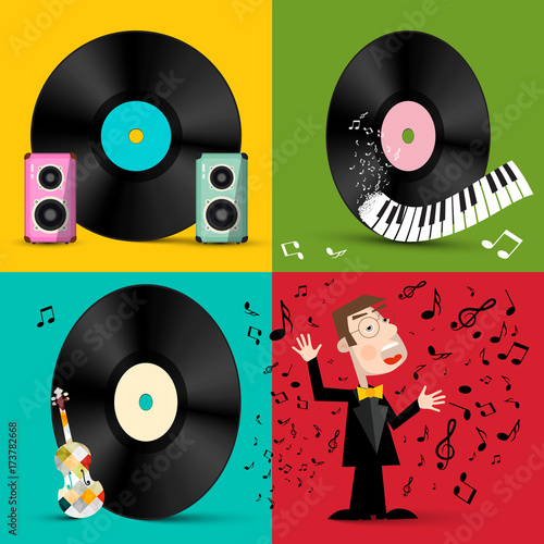 Huge loudspeaker, old vinyl LP records and micro characters listening to music, choosing vinyl plates, vector illustration. Vintage music concept for web banner website page etc.