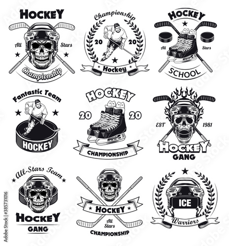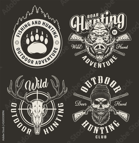 Vintage white moto skull logos, emblems, badges and labels, vector illustration isolated on black background. Motorcycle, biker skulls in helmet, goggles and face scarf, repair tools, text.