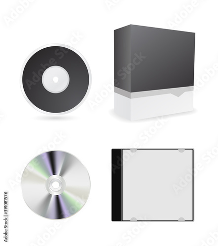 Vinyl plate with blank white cover isolated vector set. Music gramophone LP record disk with paper case cover mockup 3d design different angle view