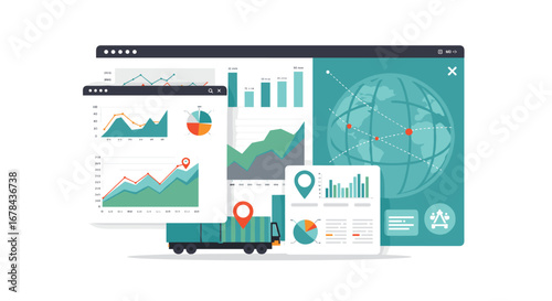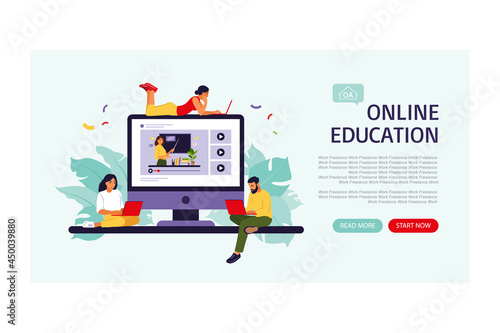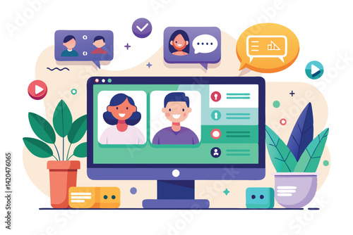 Virtual assistant business concept vector flat illustration. Huge computer monitor with micro characters business assistants engaged in office work on screen.
