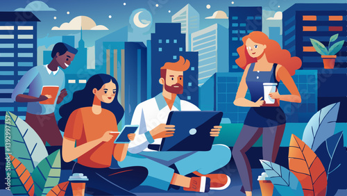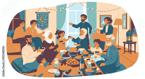 Virtual online graduation ceremony concept vector illustration. Students graduate by video call during coronavirus quarantine. Female student greets her fellow graduates in gowns and hats on a screen.