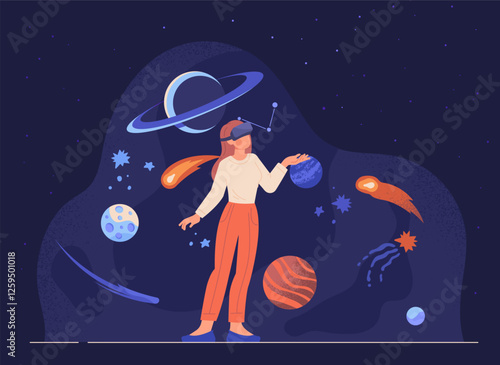 Virtual reality technology and entertainment concept vector illustration. Boy in VR headset flying in outer space with planets and stars. Space VR game.