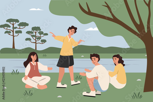 Virtual reality learning, education and vr technologies. Vector illustration of history teacher and schoolchildren in vr glasses looking at stone age family couple making hunting tools stone spears.