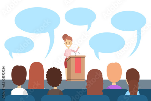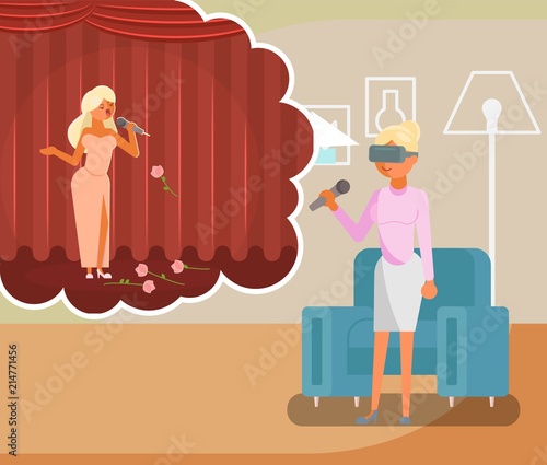 Vector illustration of woman in vr glasses singing with microphone like real singer performing on stage. Flat style design.
