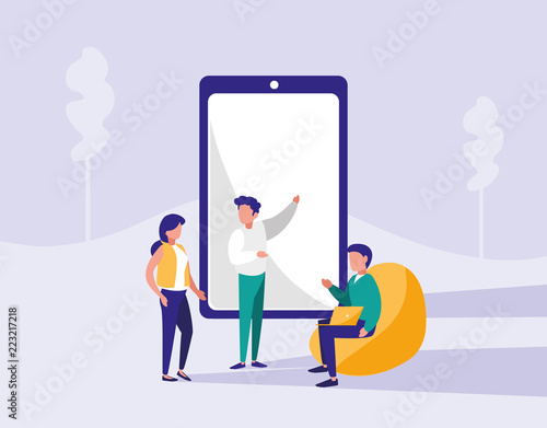 Visagiste services, vector flat style design illustration. Big eyeshadow palette and tiny characters professional makeup artists holding big brush, foundation tube. Beauty and makeup course, class.