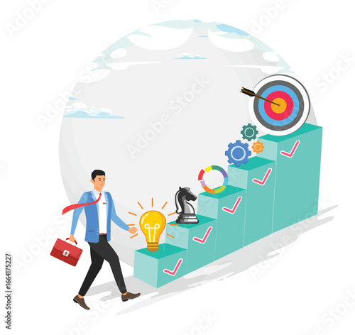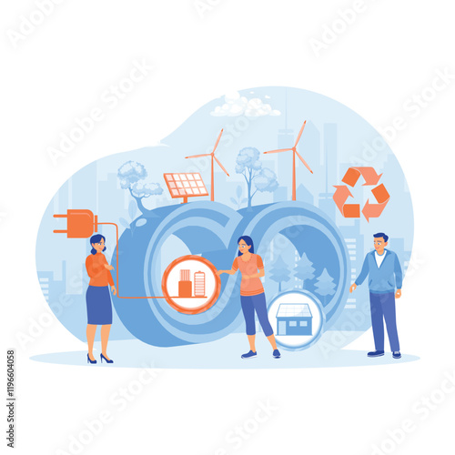 Visualization. Giant human eye, tiny male and female characters wishing for new car, summer beach travel, wealth, pet dog, flat vector illustration. Optimistic thinking, follow your dream concept.