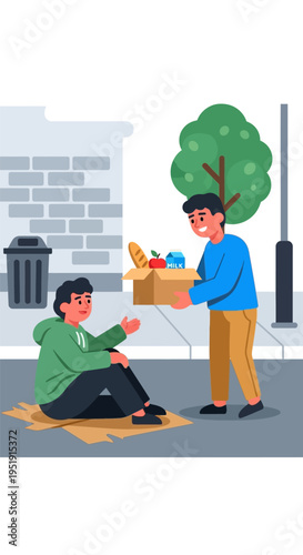 Volunteers providing clothes, food for homeless, old, poor people, collecting garbage, planting trees in city park, giving toys to orphan kids, vector illustration. Volunteering, charity, donation.