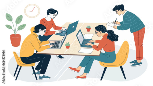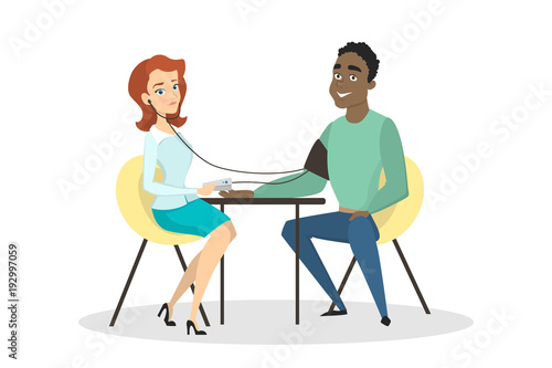 Volunteers barbers cutting hair of homeless person, flat vector illustration. Care for homeless, volunteering and charity.
