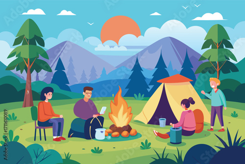 Volunteers collecting garbage into trash bags on beach, flat vector illustration. Ocean coast waste clean up, ecology, environment protection.