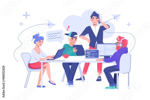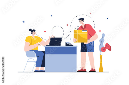Volunteers collecting money, food, clothes for homeless people, flat vector illustration. Humanitarian aid, donation box. Volunteering, charity, care for homeless, food drive.