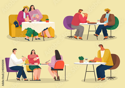 Volunteers taking care of senior people. Nursing home care and old people support concept vector illustration set. Helping with meal, walking, bringing grocery