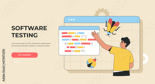 VR games vector website template, web page and landing page design for website and mobile site development. People playing VR games using laptop and vr glasses.