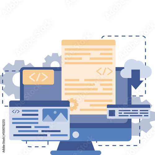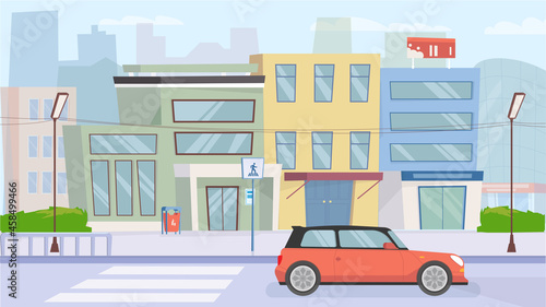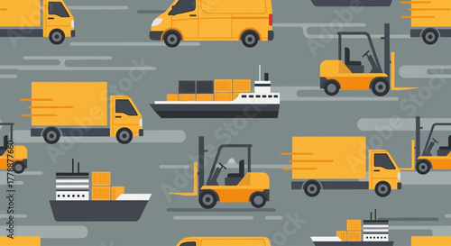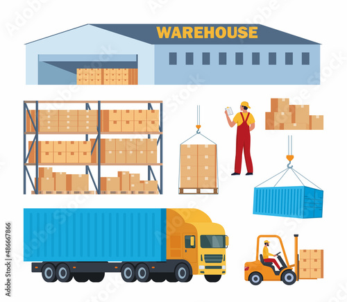 Warehouse industry cargo truck service logistics and distribution flat vector illustration. Factory for storage parcel package, merchandise and export import freight box