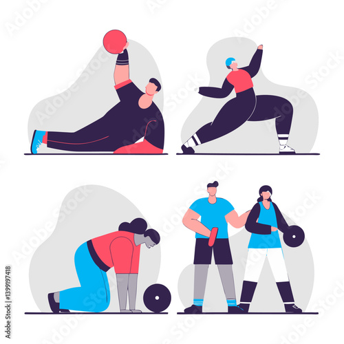 Two men garbage collectors collecting trash bags full of household waste, vector flat illustration isolated on white background. Garbage collection, park and street cleaning.