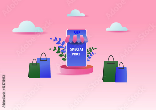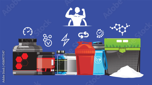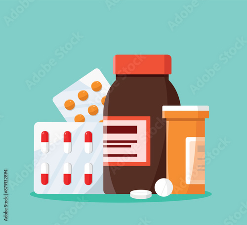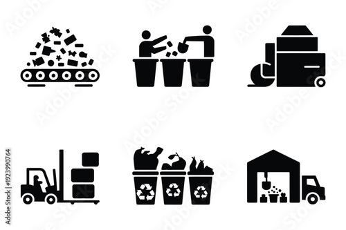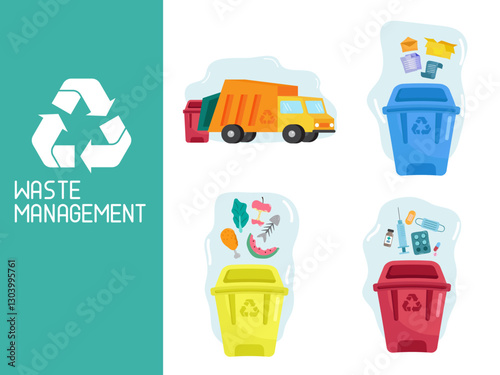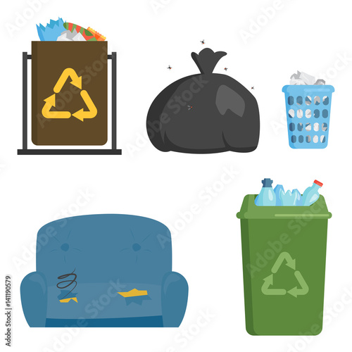 Waste plastic sorting vector flat style design illustration. Orange garbage container with recycle symbol, empty plastic bottles, containers. Ecology and recycle concept for web banner, website page.
