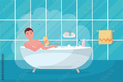 Vector illustration of swimming pool interior and young men playing water game. Water polo concept design element in flat style.