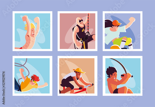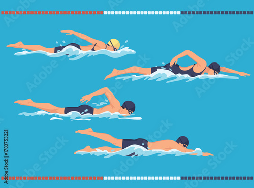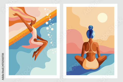 Water polo female players in action vector posters set. Women's Swimming and water sports concept. Water polo team play game in tournament.