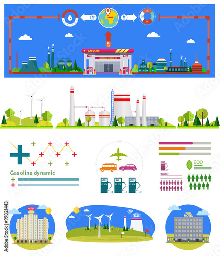 Ways of modern eco friendly city development vector concept illustration in paper art style. Urban landscape, city elements buildings, construction crane, public transport, attractions, windmills.