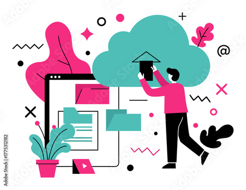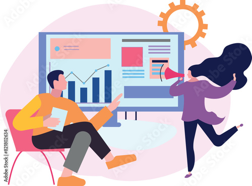 Huge laptop and micro male and female characters web developers creating website, vector illustration. Website development, web designer services composition for web banner, website page etc.