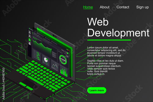 Web development, coding and programming vector banner template. Site construction service, web design studio for creation of digital software mobile, desktop platform
