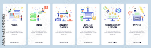 Onboarding for web site, mobile app. Menu banner vector template for website and application development. Web page, Browser settings, Global network, other walkthrough screens. Flat style design.