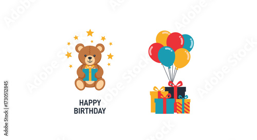 Vector flat illustration of ring with diamond, heart shaped balloons, gift boxes, bouquet of flowers, champagne, red bow tie. Wedding organization services concept for web banner, website page etc.