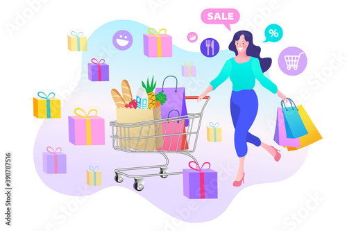 Wedding planner services concept flat vector illustration. Giant cake, gift boxes, wineglasses and tiny characters making wedding planning checklist.