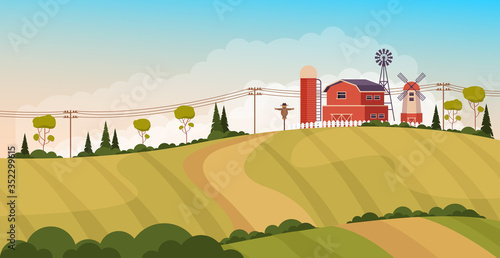 Combine harvester gathers the wheat in the field and automatically loads it in the truck. Farmers gathering the hay and loading it on the tractor. Vector banner in flat design