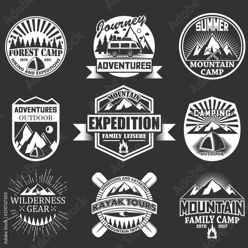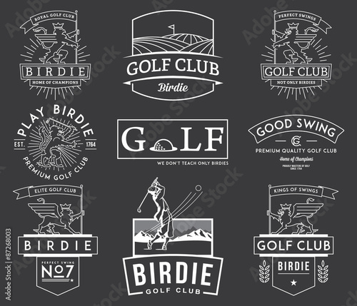 White bbq grill logo, label, badge, emblem set, vector illustration. Barbecue party, steak house vintage logos. Fresh and tasty hamburgers, steaks, kebabs, chicken. Grilled meat and vegetables.