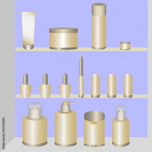 White blank bathroom cosmetic bottle mockup set, vector illustration. Realistic dispenser, spray, pump bottles on shelves. Packaging containers for cream, soap, lotion, shampoo other cosmetic products