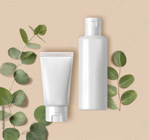 White blank cosmetic bottle mockup, paper cut craft style green mint leaves, splashes, vector illustration. Mint shampoo ads template. Beauty and hair care product.