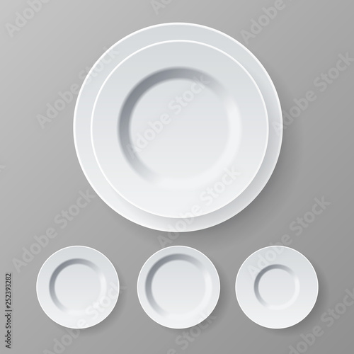 White empty ceramic crockery mockup set, vector top view isolated illustration. Realistic square, round, heart shaped dish, bowl, plate. Porcelain crockery, tableware and kitchen utensils. Kitchenware