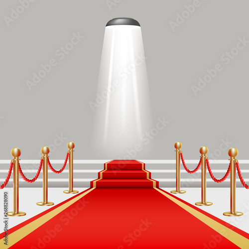 Vector illustration of white round podium with red carpet and lights. Realistic illustration on transparent background. Red carpet event design element.