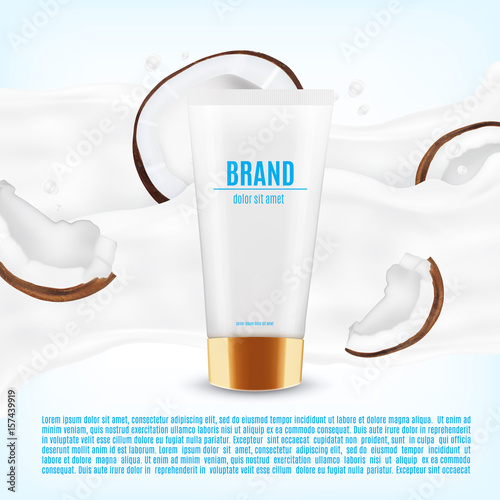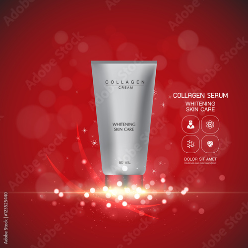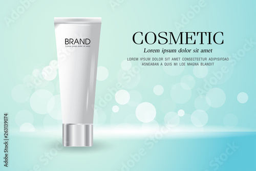 Whitening toothpaste ad poster. Vector realistic toothpaste packaging mock up with your brand on blue background with white sparkling tooth and copy space.