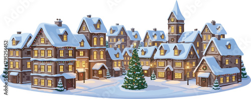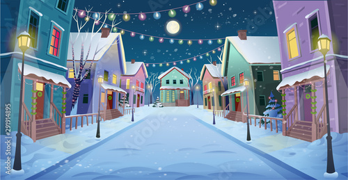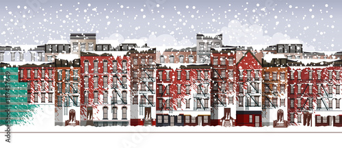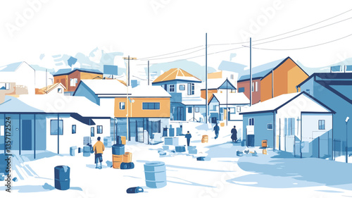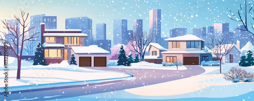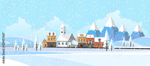 Winter and christmas holiday city landscape. Vector illustration of cute scandinavian town with ice skating rink. Family with kids playing snow on a street. Winter season background poster.