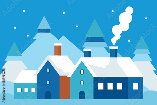 Winter background with snowy village vector illustration in paper cut craft art origami style. Christmas landscape postcard with wonderland valley and cozy houses under snow design template