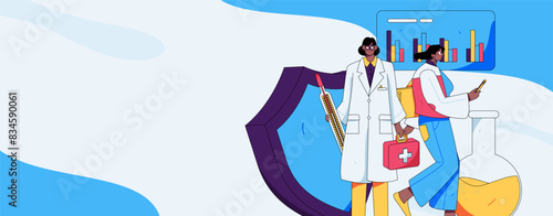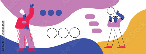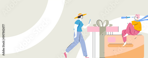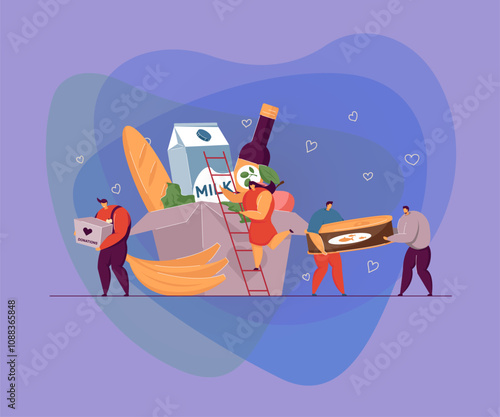 Cold winter season hot drinks, vector illustration. Micro male and female characters preparing huge mug of cocoa with whipped cream and marshmallow.