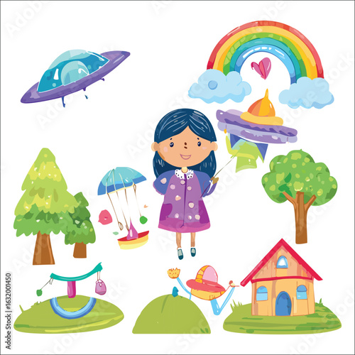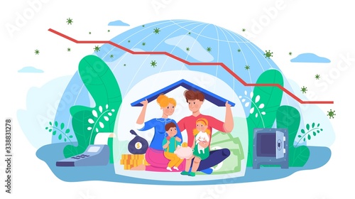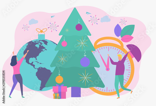 Winter holiday season vector concept illustration. Christmas sale, woman with shopping bags buy gifts. Man enjoys first winter snow. Web site design template.