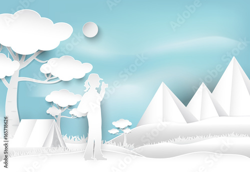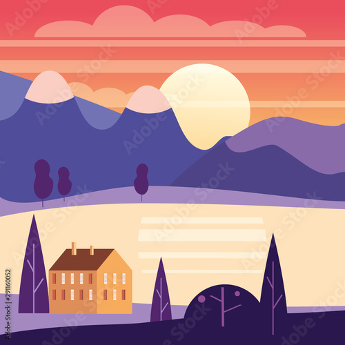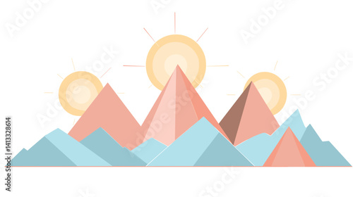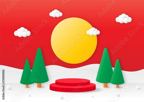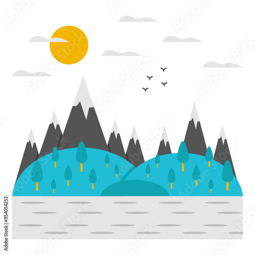 Winter mountains landscape vector 3d art design. Snowy valley with mount peak and forest tree wallpaper background. New year and Christmas concept