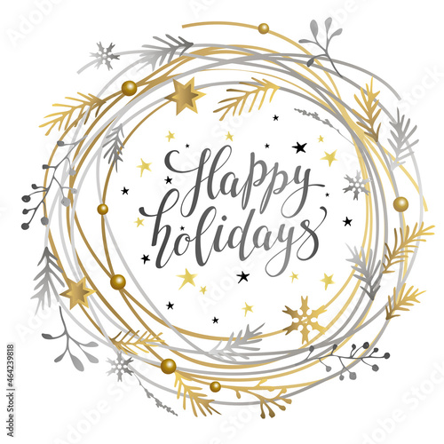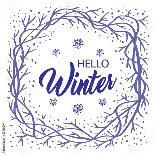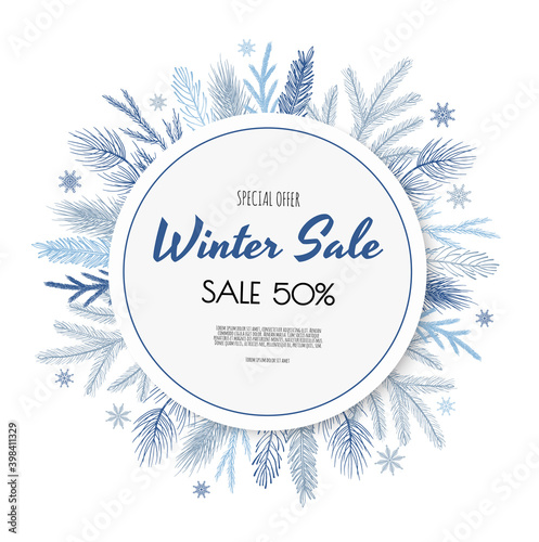 Decorative frame with snowy trees snowflakes balls Winter sale creative hand lettering typography, vector illustration in paper art craft style. Seasonal winter sale promotion banner, poster template