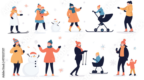Huge snowflake, happy micro male and female characters drinking hot tea, warming mulled wine, vector illustration. Winter season fun concept for web banner, website page etc.