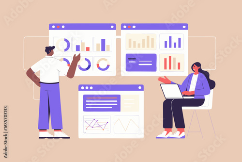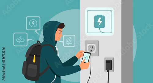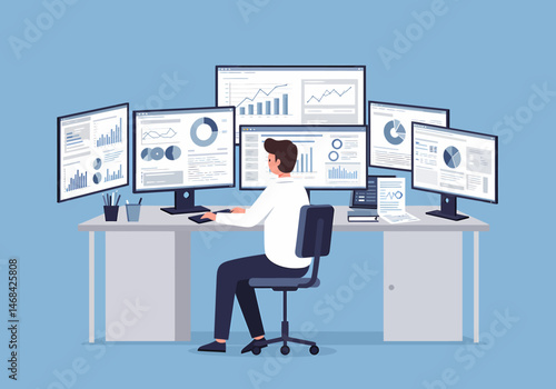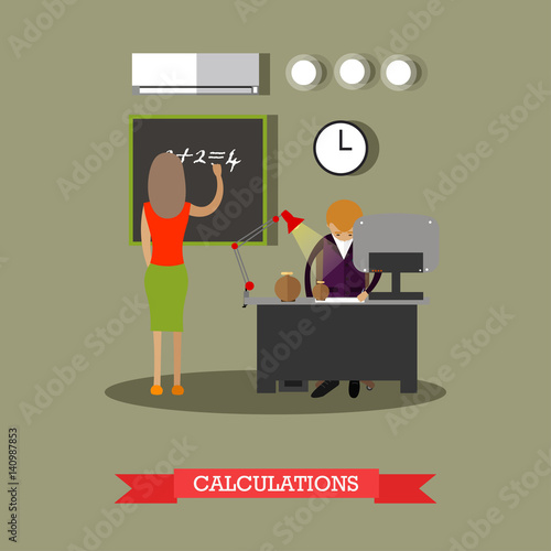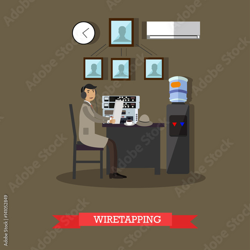 Vector illustration of detective working at office using headphones and device for wiretapping. Flat style design element.